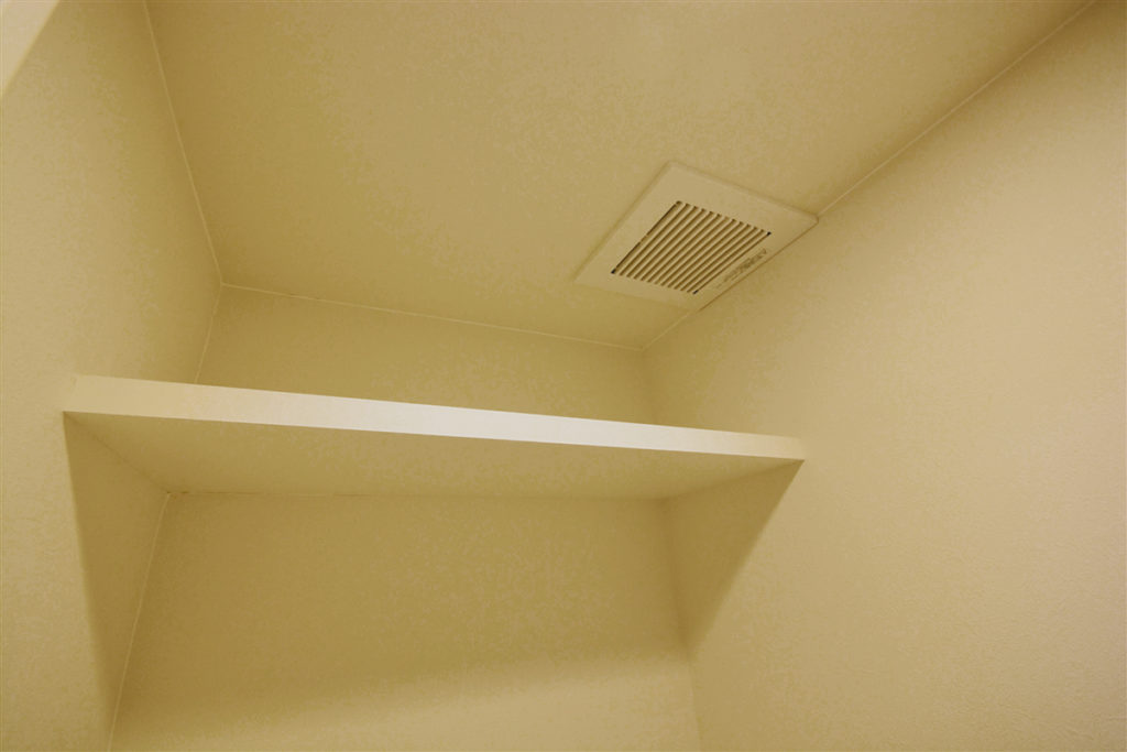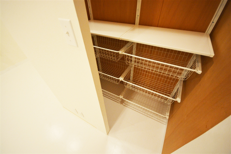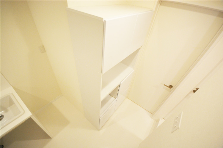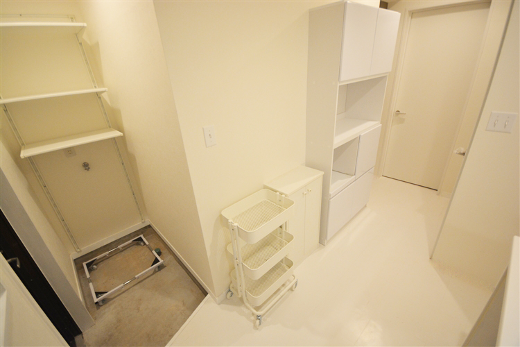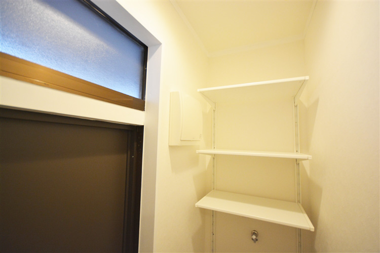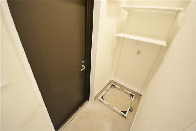 洗濯機置き場はあえてそのままに玄関前にございます。その分、洗濯機置き場上のスペースを有効活用。棚収納で洗剤などを置くことが出来ます。万が一の水漏れ時も玄関前なので被害が最小限に防げます。また掃除も便利です。