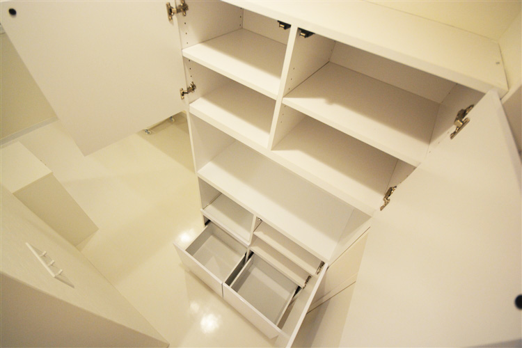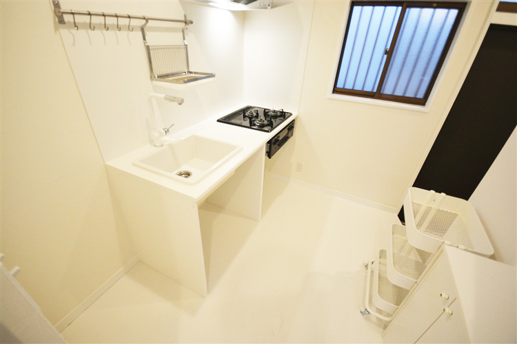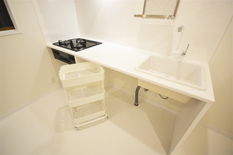 白で統一されたキッチンスペース。単身用のアパートではキッチンの横幅は165㎝が標準ですが、Tactのキッチンは1階が180㎝。2階がなんと200㎝もあります。IKEA製のワゴンやキッチンパーツが設置されております。最初から設置されている食器棚も便利です。(※2Aと2B号室には食器棚がございません)
