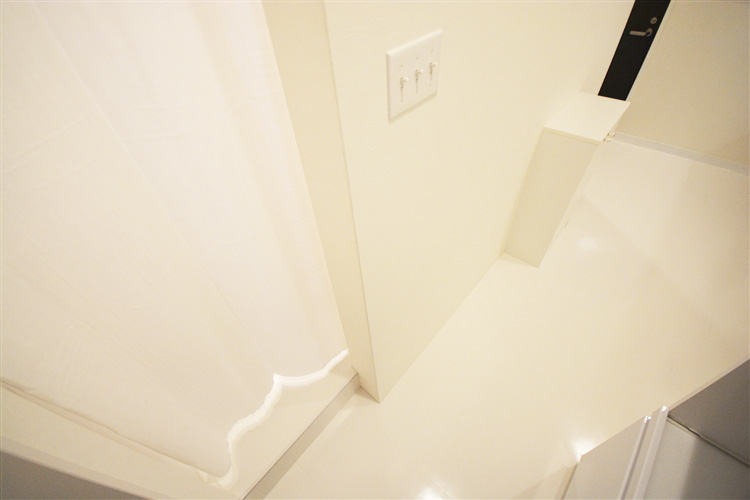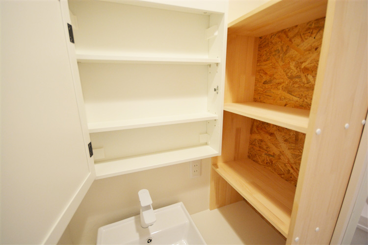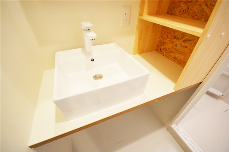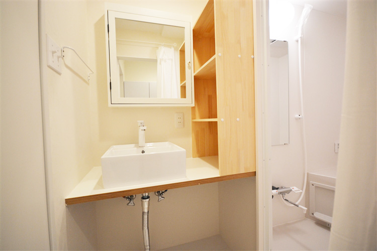 洗面所も白にこだわっています。洗面所の壁は野菜が練り込まれたしっくいの壁。水に濡れてもすぐに乾きます。ミラー裏の収納や棚が便利です。洗面台下にも物が置けます。洗面所には目隠し用のカーテン付。2F号室のみ洗面所にドアがあります。
