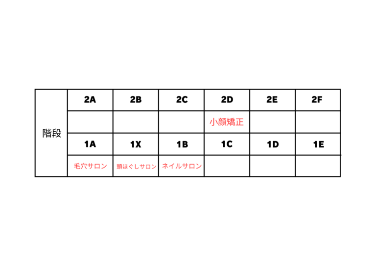 こちらが、Tactの部屋割りとなります。実は真っ白な内装デザインから女性向けのエステ店やヘッドスパのお店も入っております。