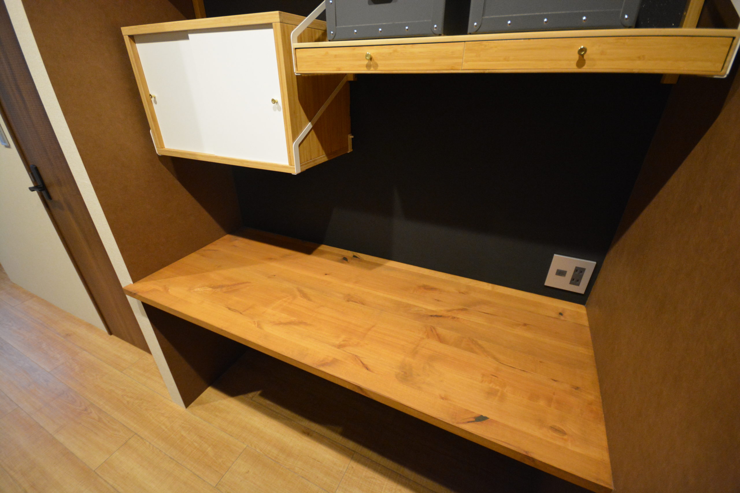 アルダー無垢材の上質なデスク。黒い壁は、黒板塗料と磁石がくっつくようにマグネットペイントを施しております。